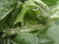 Пагонова попелиця. Невелика комаха, яка все частіше зустрічається серед молодого листя смородини. Попелиця атакує рослину, висмоктуючи з неї всі соки. В результаті такої навали, листя смородини скручуються і збираються в грудку. Пагони перестають розвиватися і обпадають. Все це призводить до знищення ягід.