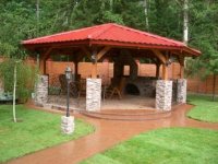 Якщо заміський будинок виконаний з цегли або каменю, зробіть з цих же матеріалів альтанку. При цьому враховуйте, що масивні споруди красиво виглядатимуть на ділянках великої площі. Повністю цегляна альтанка зустрічається рідко, адже даний тип будови повинен гармоніювати з природним куточком ділянки. Тому часто опори і стовпи виконують із каменю чи цегли, а дах — з дерева.