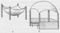 Цей вид альтанки відрізняється довговічністю і при цьому побудувати її досить просто. У першу чергу визначитеся з місцем будівництва, після цього встановіть чотири стовпи. На фанеру нанесіть паркетний віск, на неї потім будете викладати тканину і насичують її епоксидною смолою. Заздалегідь підготуйте відрізки тканини для стін. Якщо хочете, щоб стінки вийшли міцними, зробіть їх не з одного, а з декількох шарів тканини. Готові панелі закріпіть до стовпів.